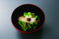 九条ねぎは口当たりの柔らかさ、特有のぬめりと甘みがあるのが特徴で、西京味噌で仕立てた酢味噌を使い、さっぱりとコクのある味わいに仕上げました。お好みで季節の品を加えて頂きお客様独自のメニューをお楽しみ頂けます。